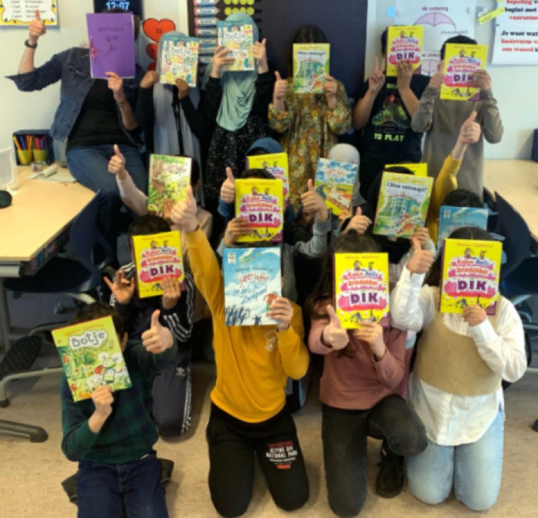 Voorlezen, vertellen hoe je een boek maakt en duizend vragen beantwoorden: gedurende het schooljaar bezoek ik ongeveer eens per week een school of bibliotheek.