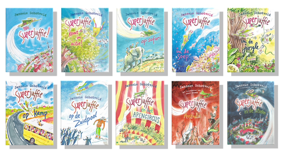 Dit is het hele rijtje! Van haar eigen achtertuintje tot aan de Zuidpool, van stadsduif tot zeeschildpad, Superjuffie is bijna overal op de wereld geweest! Je kunt haar avonturen op volgorde lezen, maar dat hoeft niet.
