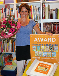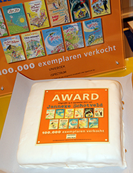 Vrijdag 6 september ging ik nietsvermoedend voorlezen in de Kinderboekwinkel aan de Rozengracht in Amsterdam. Daar kom ik sowieso al heel graag, want een het is een fijne winkel, op een fijne plek, waar ze bovendien álles weten van kinderboeken. Maar nu was het extra bijzonder, want plotseling ging de deur open en daar kwamen vrienden en familie binnen! Mijn uitgever was er al eerder, met een smoesje, waar ik heel makkelijk ingetrapt was. Vanaf dat moment was het feest! Wat bleek: van al mijn boeken zijn er meer dan 100.000 verkocht. Dat was een feestje waard, vond mijn uitgever. En ik ook!